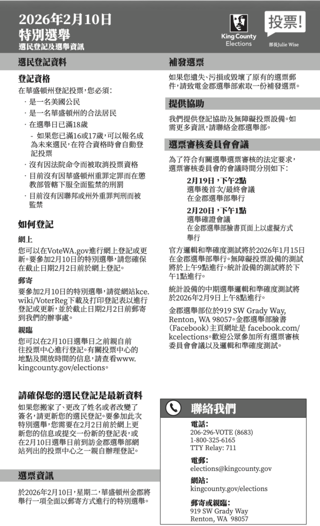 Previous Posts焦點 Updated: January 21, 2026 2026年2月10日特别选举选民登记及选举资讯 By SCT January 21, 2026 0 Share FacebookTwitterPinterestVKWhatsApp Must Read E食住行Staff - January 17, 2026懸疑劇一起緝兇 亞裔戲劇節回歸 西城工商Staff - January 16, 2026台灣觀光署首度進軍西雅圖旅展人氣爆棚 E食住行Staff - January 10, 2026亞裔喜感舞台劇慶新年 SCT Tags#election2026 Share FacebookTwitterPinterestVKWhatsApp Previous article懸疑劇一起緝兇 亞裔戲劇節回歸 - Advertisement - - Advertisement - Latest News E食住行Staff - January 17, 2026懸疑劇一起緝兇 亞裔戲劇節回歸 喜歡舞台劇的朋友,實在太有福!近日西雅... 西城工商 台灣觀光署首度進軍西雅圖旅展人氣爆棚 Staff - January 16, 2026 E食住行 亞裔喜感舞台劇慶新年 Staff - January 10, 2026 E食住行 體驗皮拉提斯 新一年運動新嘗試 Staff - January 2, 2026 西城工商 蓮生活佛新書幽靈怪談 西雅圖雷藏寺冬令送暖 Staff - December 29, 2025 - Advertisement - More Articles Like This 2025年11月4日普選及特別選舉,選民登記及選舉... Previous Posts SCT - October 15, 2025 新噴水公園 夏日免費消暑地 Previous Posts Staff - August 7, 2025 May Is Hepatitis Awarenes... Previous Posts SCT - May 28, 2025 由 Jet City Improv 和 Pork ... E食住行 SCT - April 30, 2025 - Advertisement -
